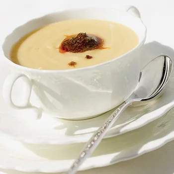 In the English countryside outside Cambridge is a house called the Old Vicarage, which used to be the priest’s house for the church across the way. A wonderful family owns it and raised their six children there. In the summers, they rent the place to groups. The mother, father, and children do the cooking and serving. The food is always from their garden or bought from the local market or farms. The table for lunch fare is set with a large steamy bowl of soup, platters of garden-fresh salads, country bread, seasonal fruit, and a yummy dessert. This recipe is one of theirs. The creamy yellow soup is set off by a dollop of red spicy butter and served with warm pita breads. Any leftover butter can be used for topping potatoes, pasta, or tofu.